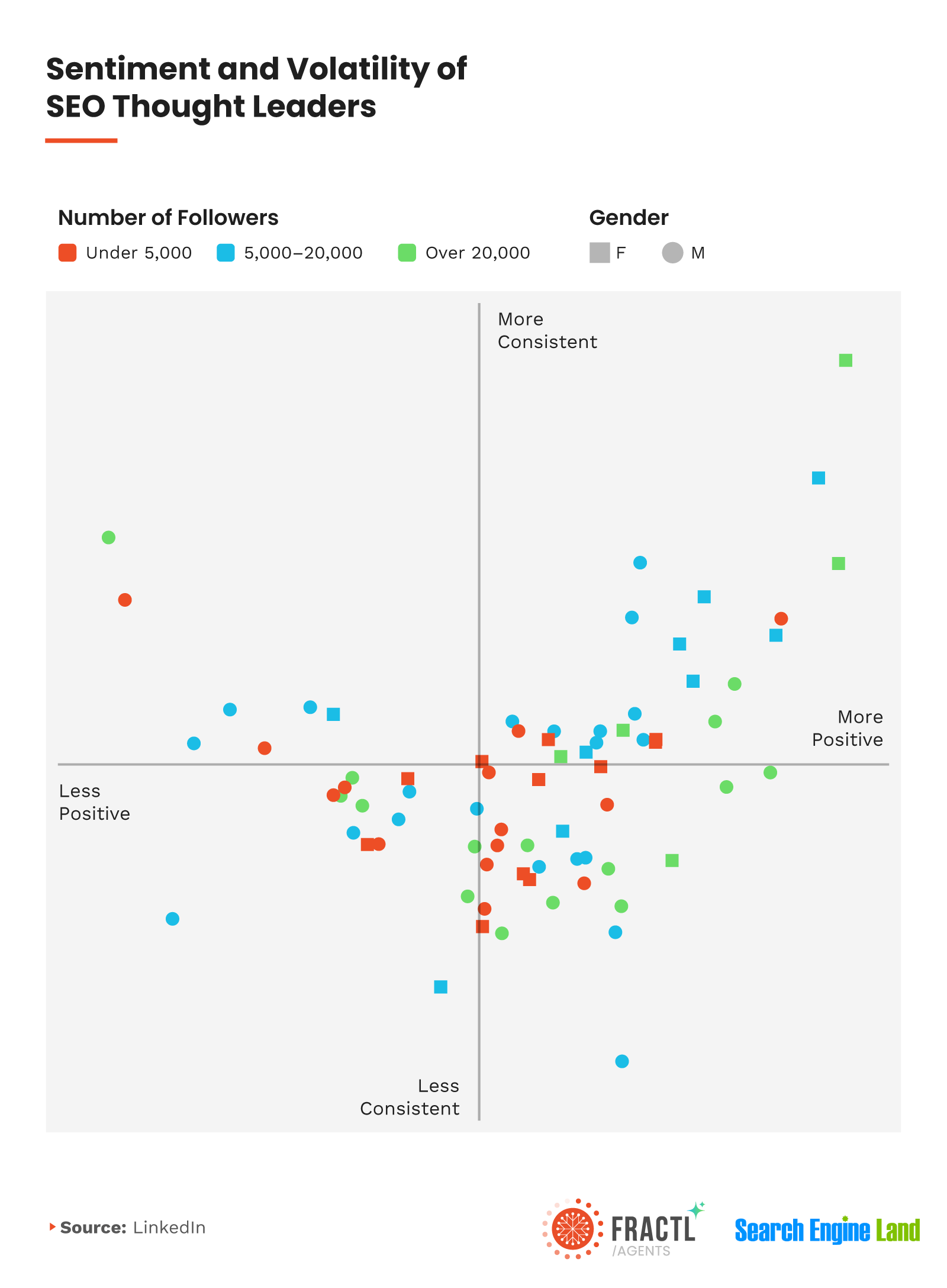 Scatter plot showing sentiment and volatility of SEO thought leaders on LinkedIn, comparing positivity and consistency by follower count and gender.