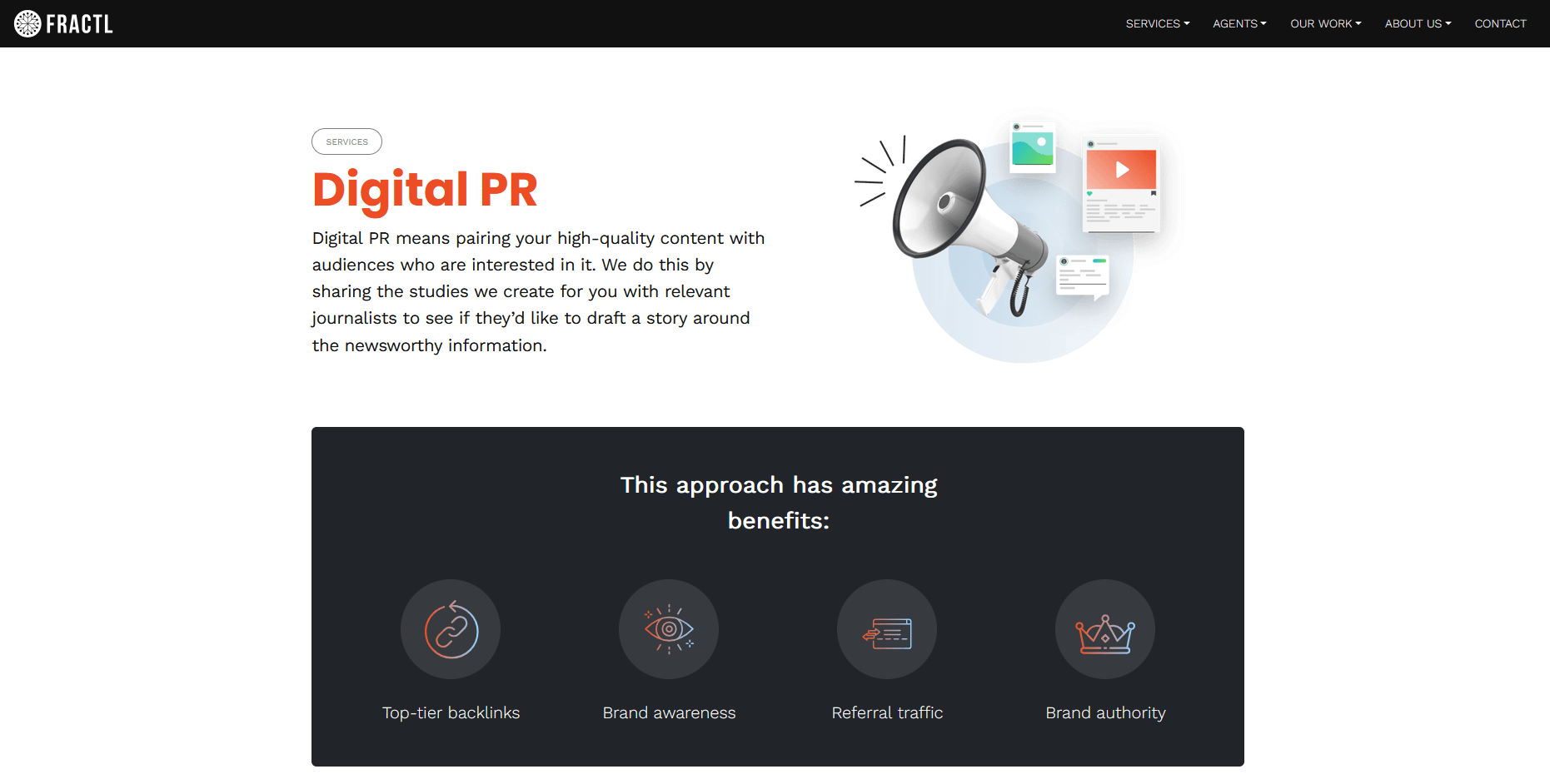 Fractl digital PR services page explaining how digital PR earns top-tier backlinks, boosts brand awareness, drives referral traffic, and builds brand authority through journalist outreach.