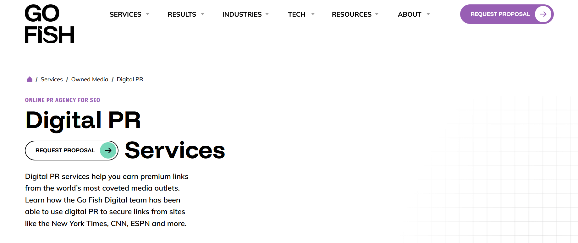 Go Fish Digital PR services page promoting online PR agency for SEO, premium link building from major media outlets like New York Times, CNN, and ESPN.