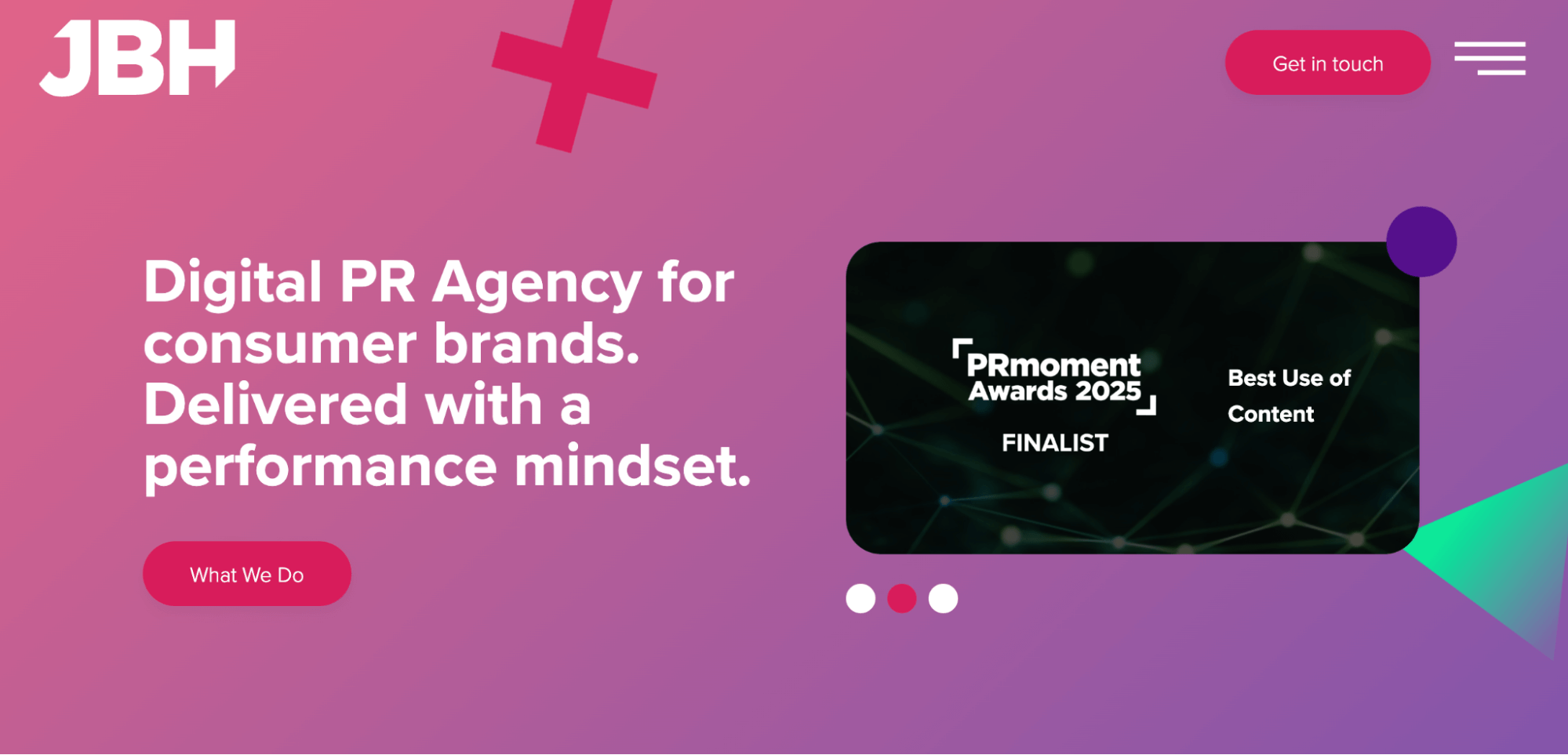 JBH digital PR agency homepage for consumer brands highlighting PRmoment Awards 2025 finalist recognition and performance-led public relations strategy.