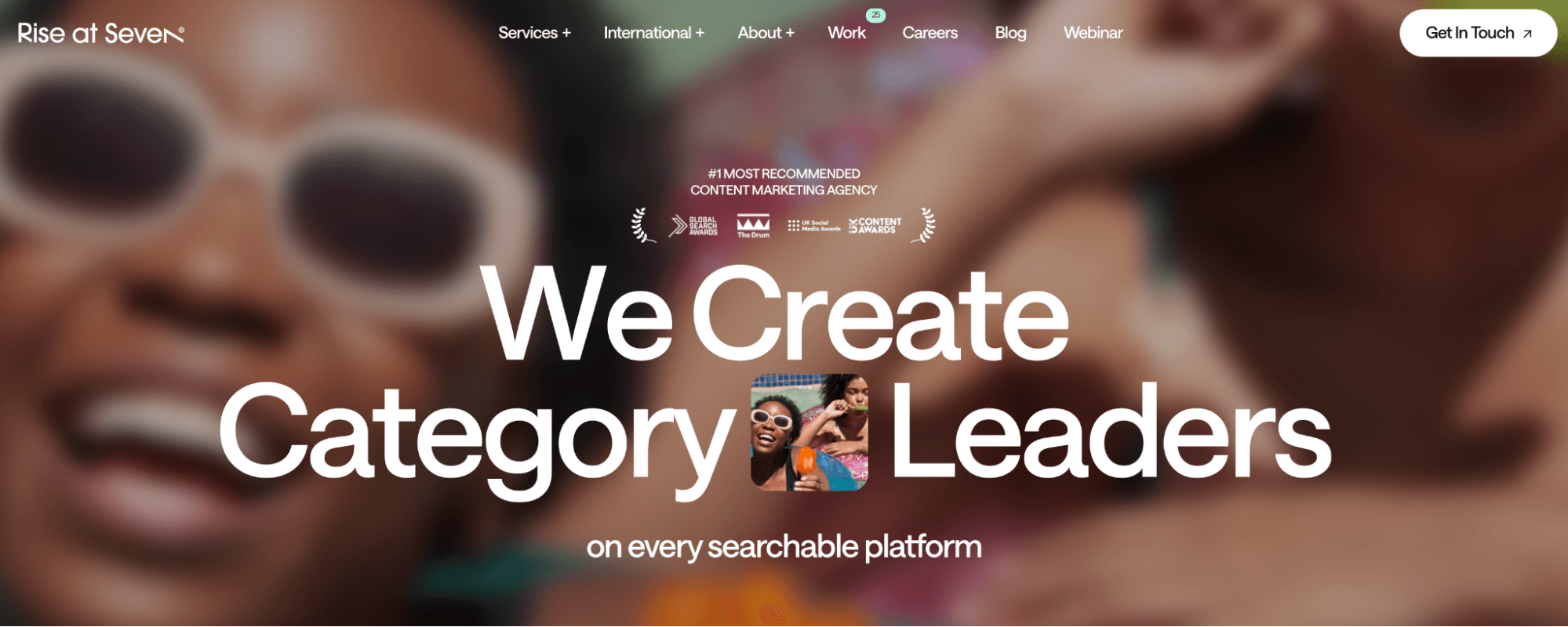 Rise at Seven content marketing and digital PR agency homepage showcasing category leadership across searchable platforms and award-winning content strategy.